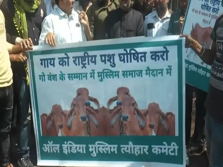 भोपाल के पुराने शहर स्थित इतवारा चौराहे पर मंगलवार को एक अलग ही तस्वीर देखने को मिली। ऑल इंडिया मुस्लिम त्योहार कमेटी के बैनर तले मुस्लिम समाज के लोगों ने शांतिपूर्ण प्रदर्शन करते हुए गाय को राष्ट्रीय पशु घोषित करने की मांग उठाई। इस दौरान बड़ी संख्या में लोग मौजूद रहे और “गौ माता का सम्मान करो” जैसे नारे भी लगाए गए।