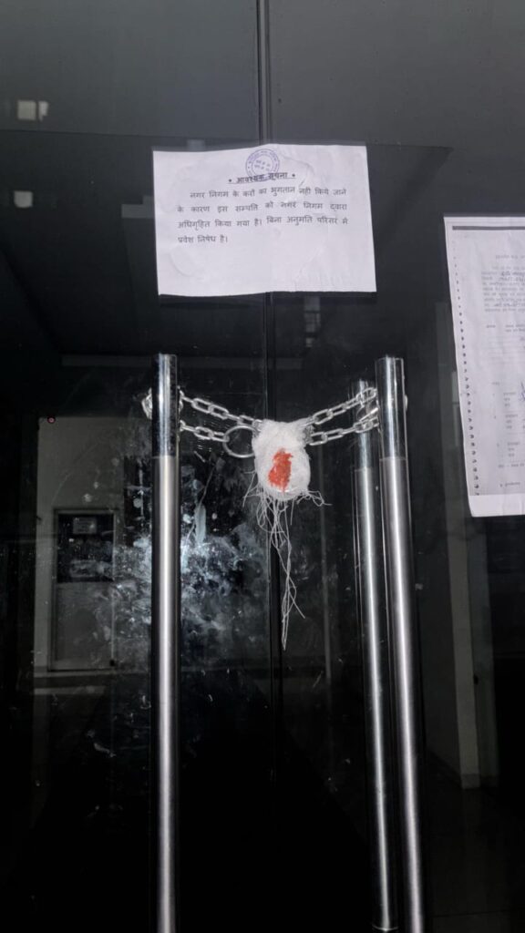 नगर निगम जोन 13 के अमले ने वार्ड 52 स्थित कोरल वुड्स क्लब हाउस को सील किया। निगम के अनुसार, बिल्डर ऋषि कंस्ट्रक्शन के नाम पर प्रॉपर्टी टैक्स बकाया था। नोटिस दिए जाने के बावजूद टैक्स जमा नहीं हुआ, जिसके बाद कुर्की और तालाबंदी की कार्रवाई की गई।