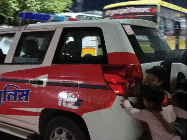 इस घटना का वीडियो शनिवार को सोशल मीडिया पर सामने आया, जिसमें कुछ बच्चे पुलिस वाहन को धक्का देते नजर आ रहे हैं।